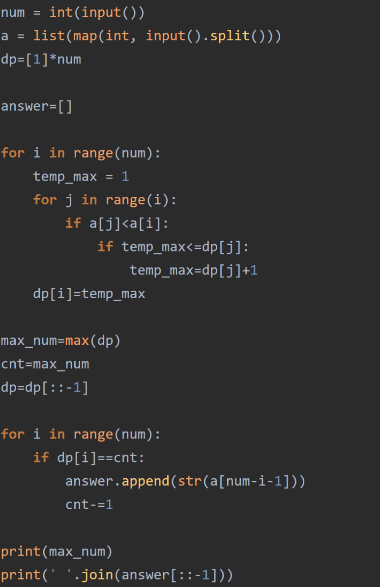 이렇게 dp 리스트를 만든 후, 뒤집어서 큰 수부터 하나씩 취하면 LIS를 찾을 수 있다.