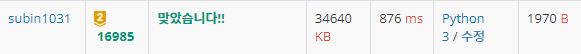 백준 13334 - 철로 (Python) (0) 2023.07.10 백준 3745 - 오름세 (Python) (0) 2023.07.10 백준 1507 - 궁금한 민호 (Python) (0) 2023.07.10 백준 11780 - 플로이드 2 (Python) (0) 2023.07.10 백준 1949 - 우수 마을 (Python) (0) 2023.07.10