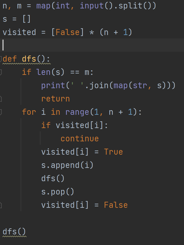 - dfs의 탈출 조건은 s라는 현재 배열의 길이가 m, 즉 내가 만들고자 하는 순열의 길이와 같을 때이다.