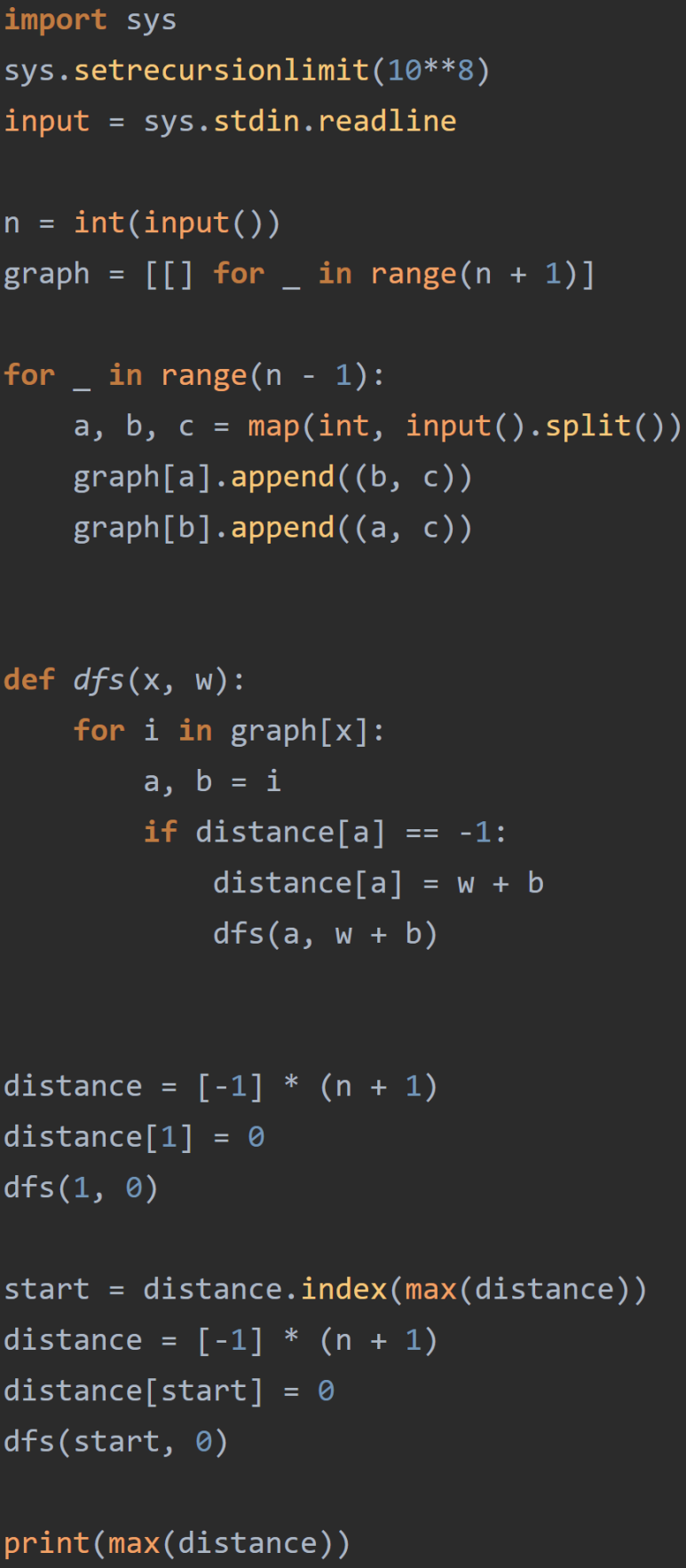 따라서 루트 노드인 1의 최대 거리를 구하는 과정에서 만나는 자식 노드를 가진 부모 노드의 결과를 dp라는 리스트에 저장해둔다. 그러면 결과적으로는 dfs(root node,0)만 해주면 답을 찾을 수 있다.
